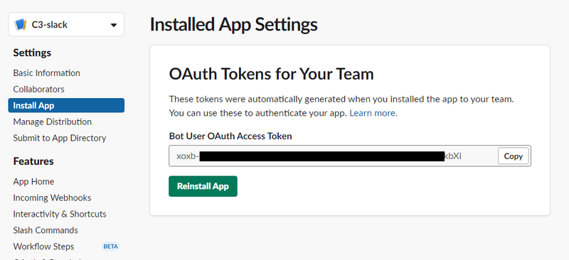 追加後、App のアクセストークン情報を控えておきましょう。C3 の Gateway、Relay が Slack にアクセスするために必要です。