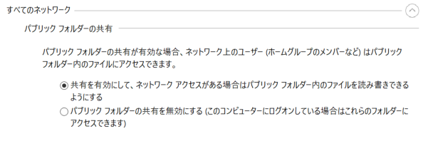共有オプションでパブリックフォルダの共有のゲストアクセスを有効にすることで、Public フォルダが他ホストからアクセスできるようになります。(要管理者権限)