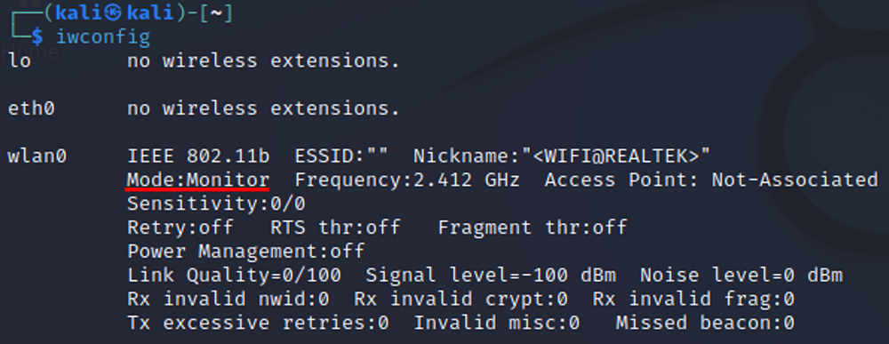 wifiのパケットをキャプチャするには、wifiインタフェースをMonitor modeに変更する必要があります。 ここではMACアドレスも変更しておきます。MACアドレスとは機器固有の番号で、PCやスマホについている名前のようなものです。このMACアドレスを変更することで誰が犯人(攻撃者)なのかをわかりにくくすることができます。今回は自身の環境でやるので特に変更の必要はないですが様式美のためやりました。