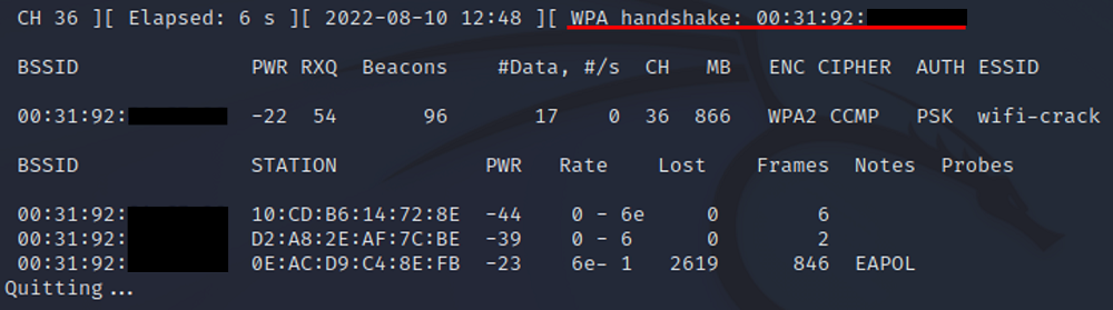 #airodump-ng --bssid 00:31:92:X:X:X --channel 36 --write test100 wlan0
