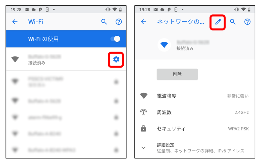 ネットワークに接続後、接続したネットワークのSSIDの横にある歯車マークをタップします。