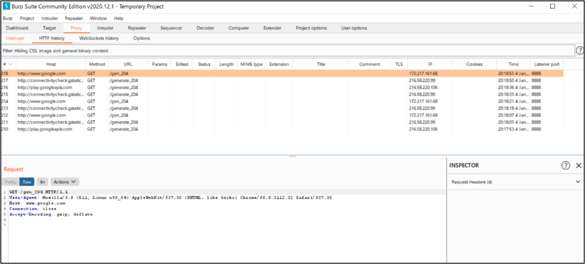 下図は、Burp Suiteの画像となります。Requestのみが表示されており、Responseが表示されていないことからサーバとの通信が正常に行えていないことを確認できます。