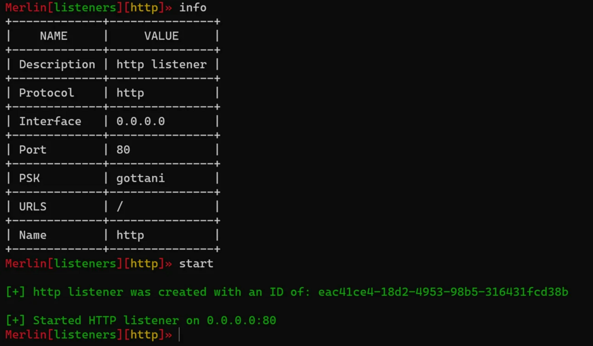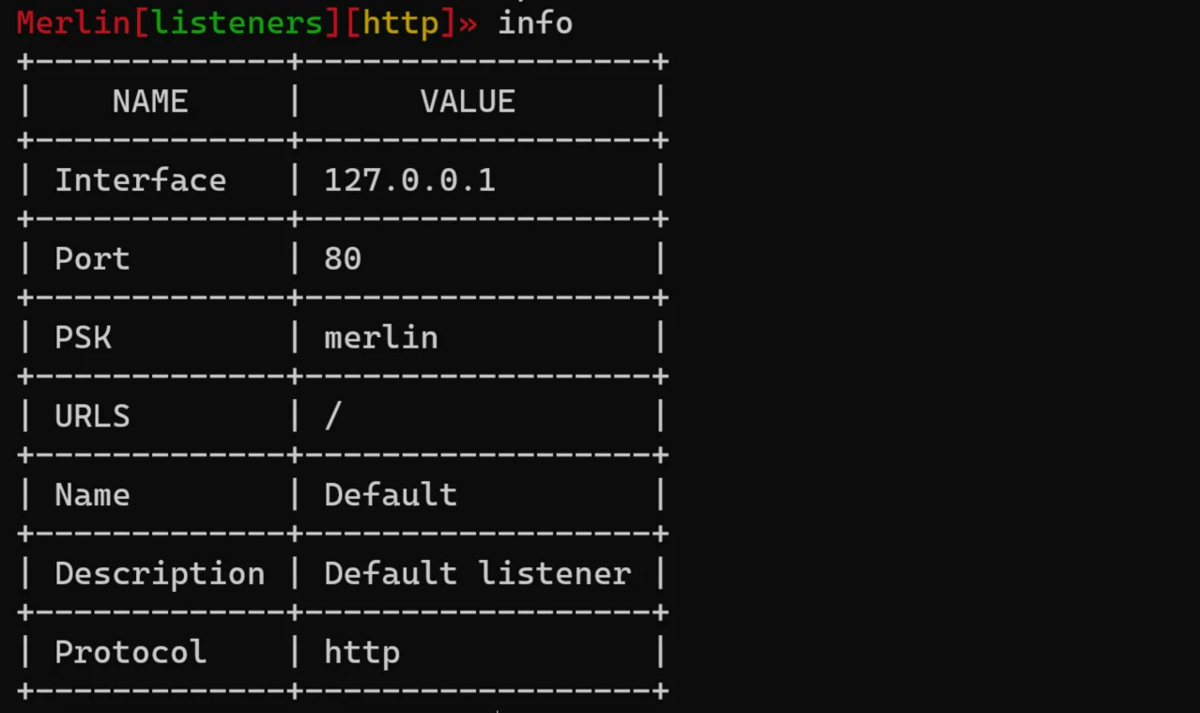 Merlin[listeners][http]» set Interface 0.0.0.0 Merlin[listeners][http]» set PSK gottani Merlin[listeners][http]» set Name http Merlin[listeners][http]» set Description http listener