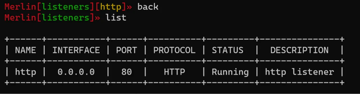$ sudo ./merlinServer-Linux-x64 Merlin» listeners Merlin[listeners]» use http
