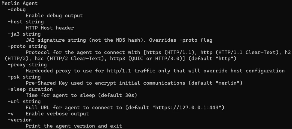 ここまで来たら、後は実際に標的想定端末上でエージェントを実行するだけです。エージェントは以下のオプションを指定可能です。