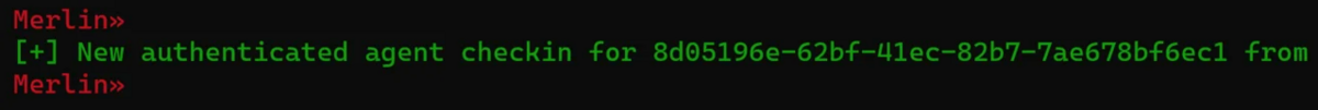 C2 サーバとのセッションが確立すると、Merlin のコンソールにチェックインに成功した旨のログが出力されます。
