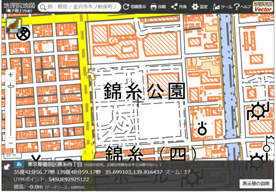 (https://maps.gsi.go.jp/#17/35.699103/139.816437/&base=std&ls=std&disp=1&vs=c1j0h0k0l0u0t0z0r0s0m0f2 )